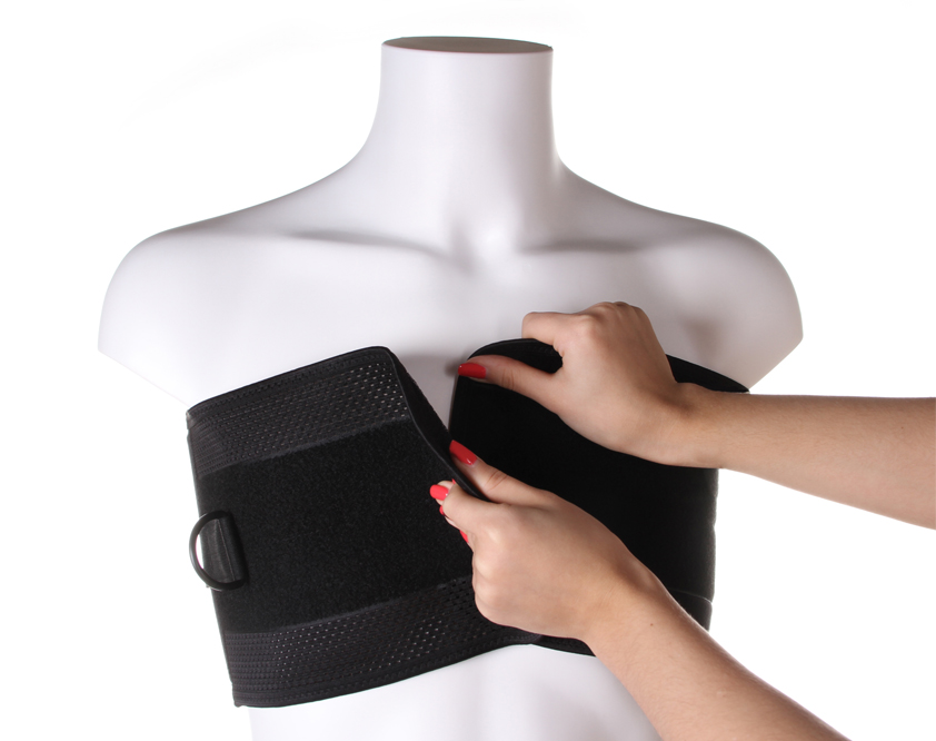 при необходимости (кашель, физическая нагрузка, любое действие связанное с расширением грудной клетки) увеличьте степень компрессии (утяжки) с помощью широкого ремня с пластиковой рамкой на конце, потянув за него и, при достижении необходимой степени фиксации, закрепив на бандаже (постарайтесь избегать резких движений, степень компрессии (утяжки) должна повышаться плавно, без возникновения болевых ощущений)